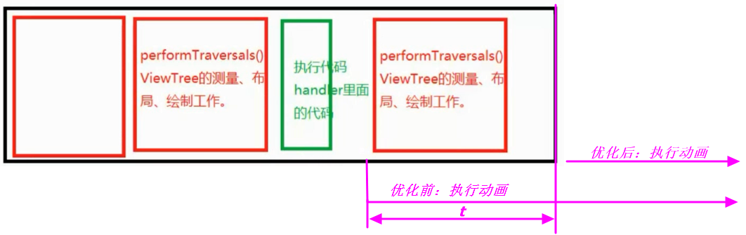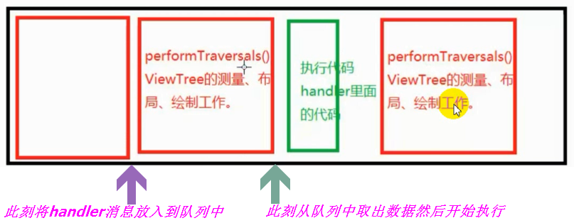 【答】是在执行完第一次的performTraversale()之后才开始执行handler.postDelay插入的动作的(perfromTraversales()方法会执行两次)。此前该动作是在MessQueue中排队等待。